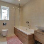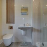 Low level WC and wash hand basin. Radiator. Downlighters to ceiling.