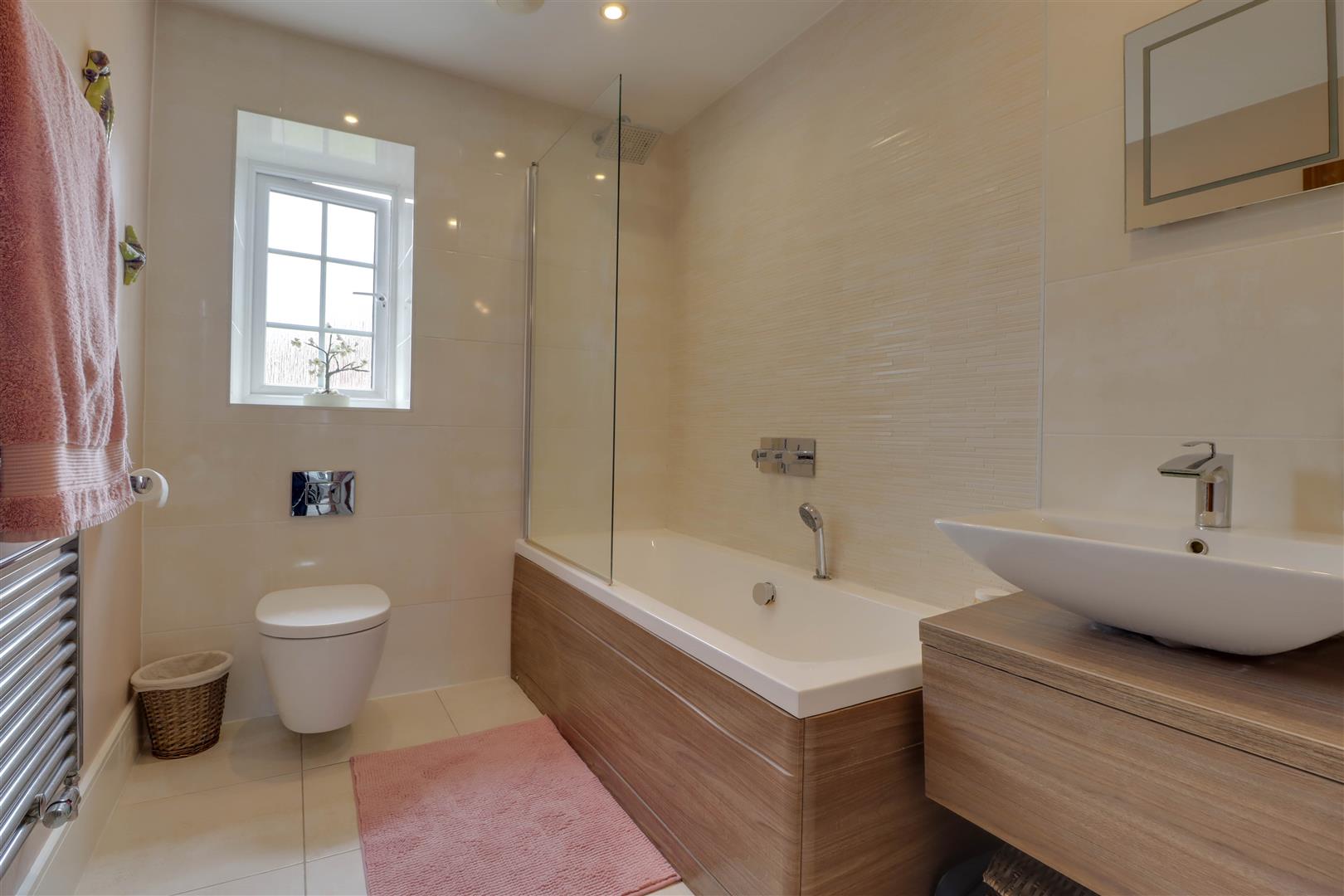 Double glazed opaque window to front. Suite comprising of low level WC, wash hand basin and panel enclosed bath unit with shower and screen. Tiled surround. Radiator/rail. Shaver point.