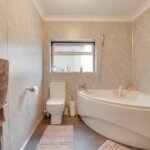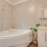 Double glazed opaque window to side. Suite comprising of low level WC, vanity wash hand basin and corner bath unit. Tiling to floor. Radiator/rail (untested).
