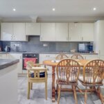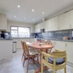 Double glazed window to side. Range of base and wall mounted units providing drawer and cupboard space with work top surface extending to incorporate inset sink unit. Integrated dishwasher and fridge freezer (appliances untested). Built in oven, hob and extractor fan above (all untested). Tiling to floor and splashback.