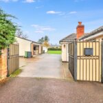Secure gated parking for numerous vehicles with additional in/out driveway to front providing access to further garage.