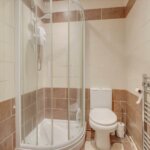 Suite comprising of low level WC, vanity wash hand basin and shower cubicle. Extensive tiled surround. Radiator/rail (untested).