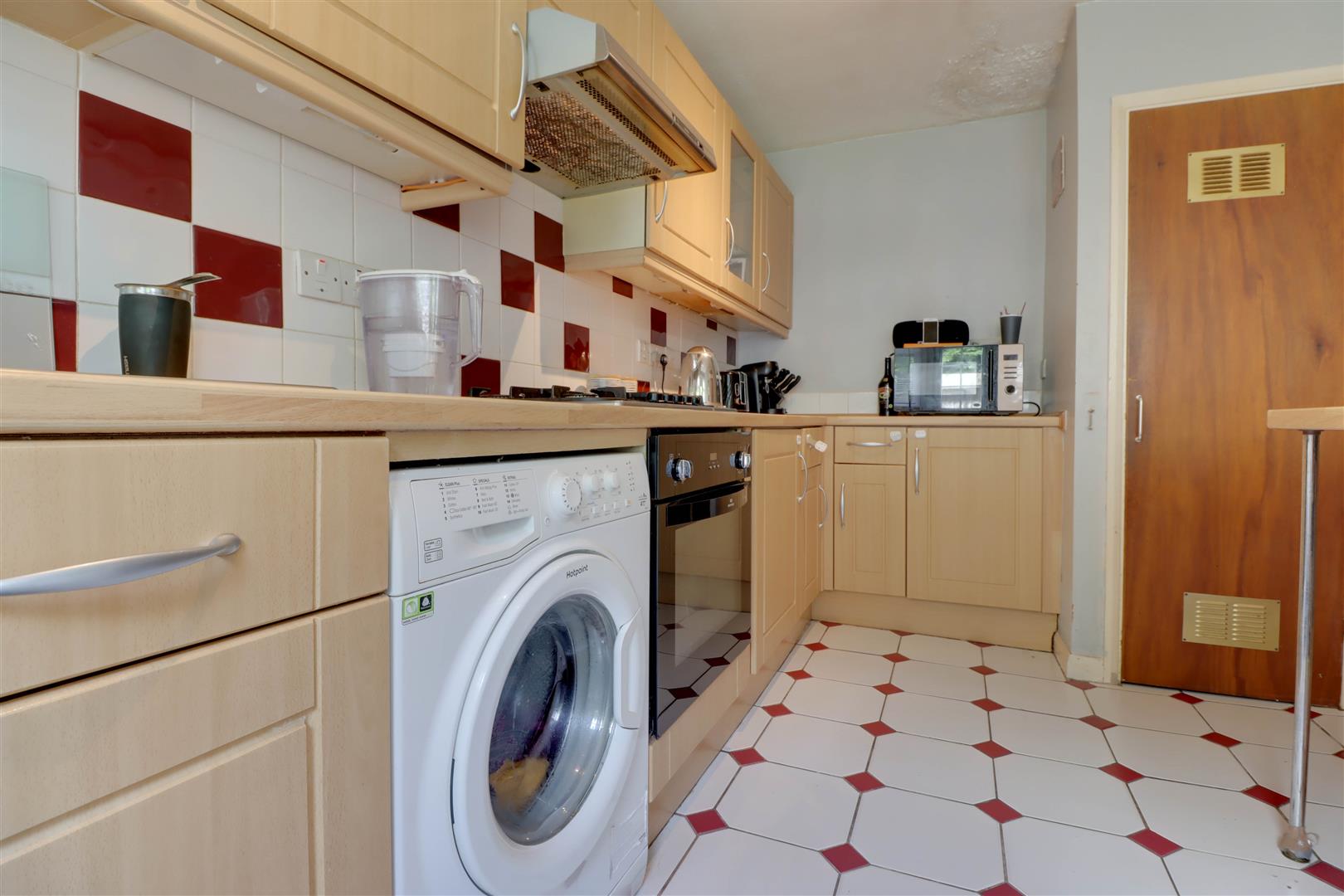 Double glazed window and double glazed door to rear garden. Range of base and wall mounted units providing drawer and cupboard space with work top surface extending to incorporate inset sink unit with cupboard beneath. Display cupboards and shelving. Space for washing machine and fridge freezer. Built in oven, hob and extractor fan above. Tiling to floor and surround.