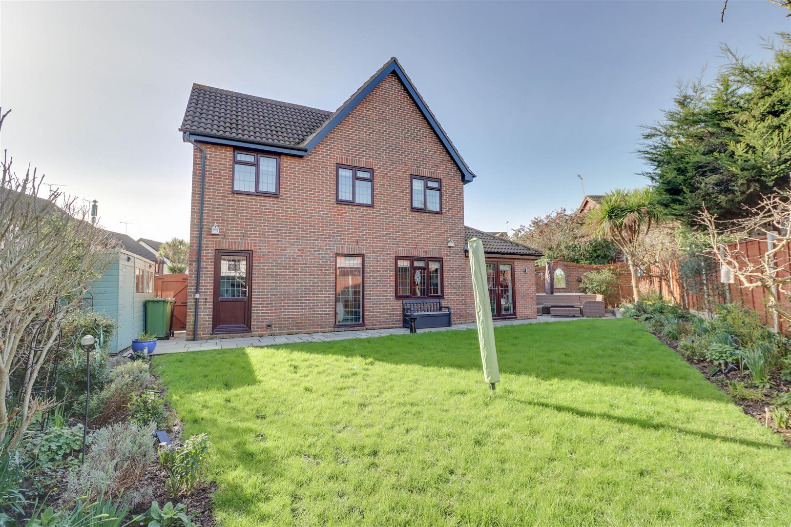 The property is situated on a wide corner plot with paved patio extending to immediate rear with remainder laid to lawn with flower and shrub borders. Fencing to side and rear boundaries. Sheds to side. Access via path and gate. Double glazed door to: