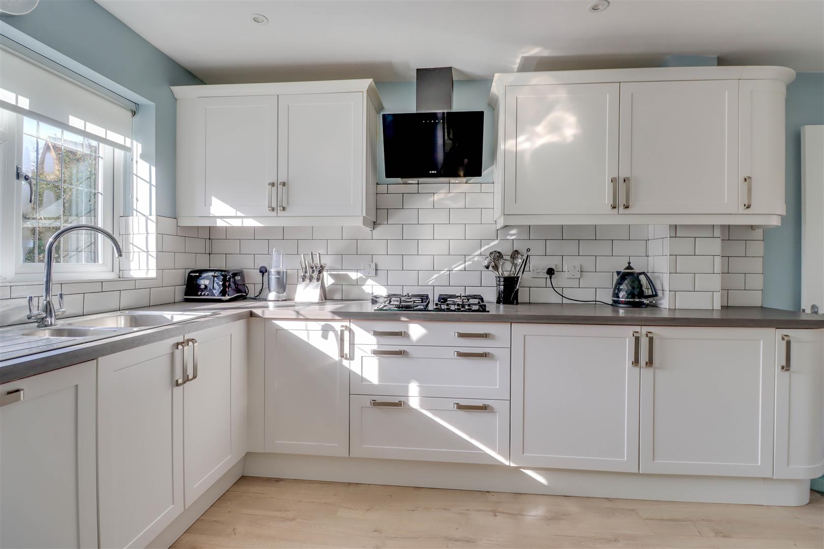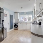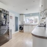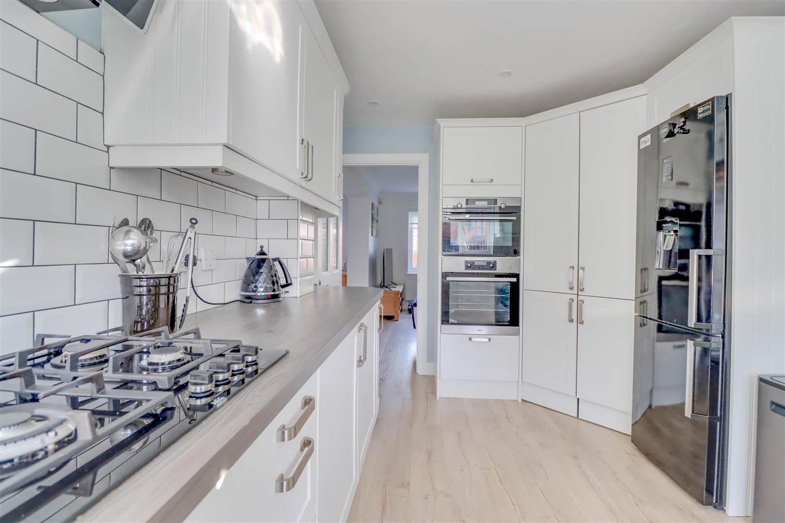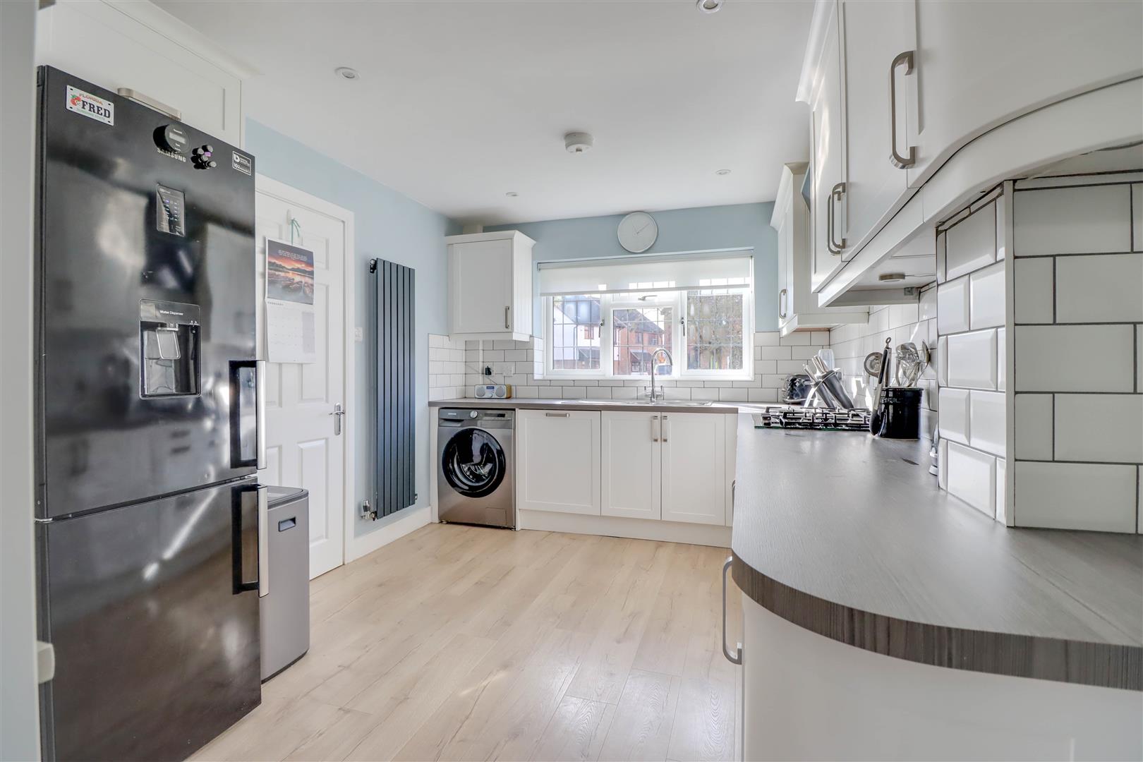 Double glazed window to front. Range of base and wall mounted units providing drawer and cupboard space with work top surface extending to incorporate inset sink unit with cupboard beneath. Walk in corner unit. Built in oven, grill, hob, microwave and extractor fan. Integrated dishwasher. Space for washing machine and fridge freezer. Upright radiator.