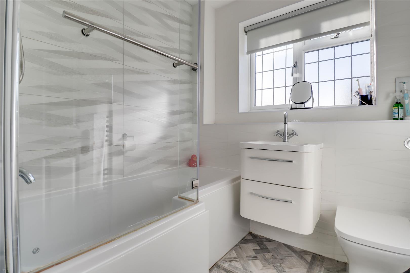 Double glazed opaque window to front. Suite comprising of low level WC, vanity wash hand basin and panel enclosed bath unit with shower and screen. Extensive tiled surround. Radiator/rail. Extractor fan. Downlighters to ceiling.