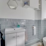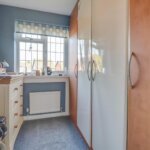 Double glazed opaque window to front. Suite comprising of low level WC and vanity wash hand basin. Tiled surround. Cupboard storage.